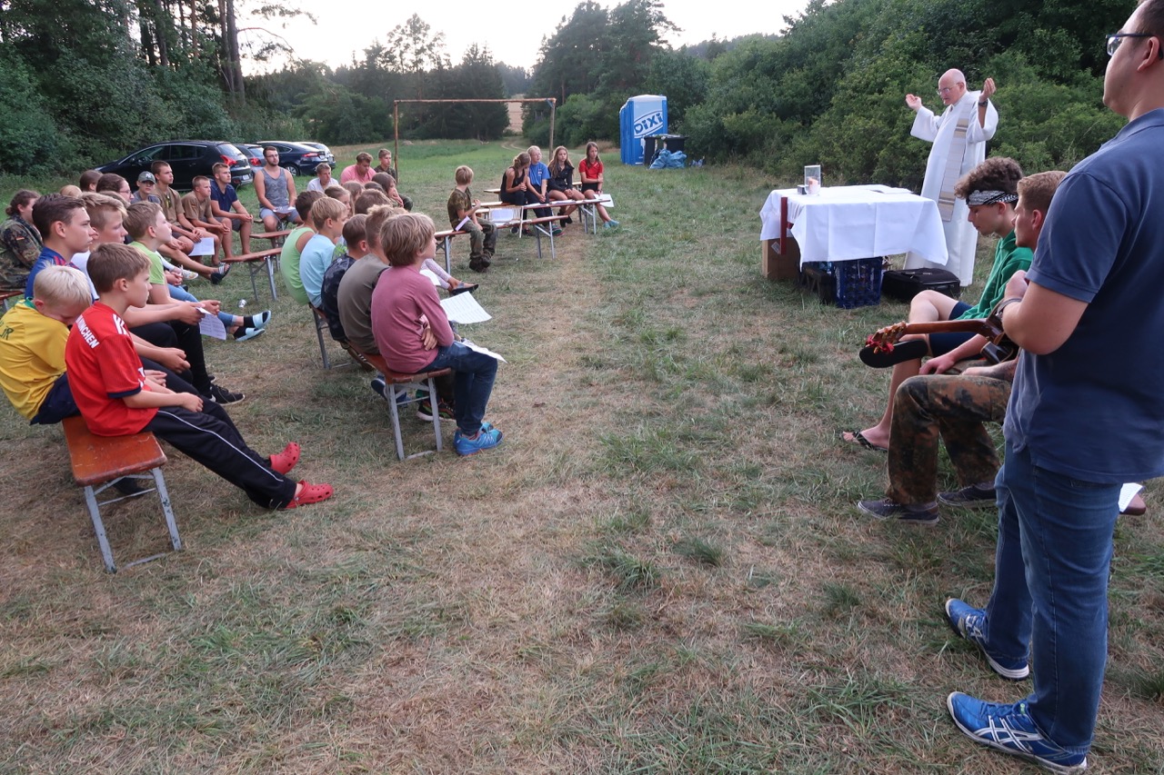 Dieses Jahr fuhr die KJG St. Michael Amberg für ihr Zeltlager wieder nach Reusch. Die Kinder wurden am Sonntag bei gutem Wetter empfangen und dann ging es auch schon gleich ans Zelte aufbauen. Als diese dann standen, konnten die Eltern verabschiedet werden und die Lageratmosphäre kam zur Geltung. Um sich gegenseitig kennenzulernen, gab es noch einige Kennenlernspiele und zur Kräftigung am Abend einen Wurstsalat von unserer tollen Küche. Am nächsten Tag haben wir uns um die Gestaltung unseres Lagers gekümmert. Ein Altar wurde errichtet, ein schwarzes Brett gebaut und das Lagerkreuz aufgestellt. Dieses spielt eine essentielle Rolle im Lager. Nicht nur dient es als ein Platz zum Beten, sondern dort wird auch das Kuscheltier befestigt, welches Ziel für die Überfäller ist. Am Abend wurde noch Holz geholt, damit wir ein schönes, großes Lagerfeuer haben.